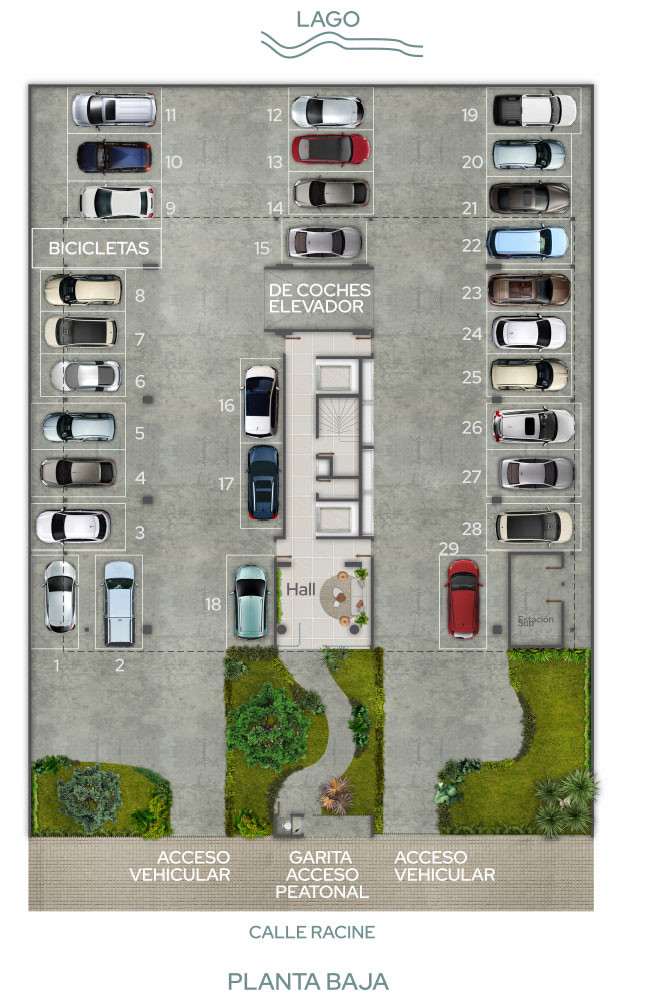 Borneo Lago cuenta con 15 niveles. La planta baja y el primer piso serán destinados a sitios de garaje. Desde el piso 2 al 13, se ubican los cómodos apartamentos de 2 dormitorios, sólo 4 por nivel.