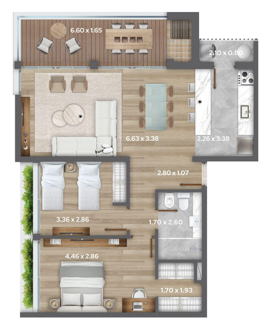 TÉRMINOS LEGALES. Las áreas están consideradas según los criterios de APPCU. Área Propia: Según propiedad horizontal. Muros: 100% muros exteriores. 100% muros separativos con áreas comunes. 50% muros separativos entre unidades y medianeros. Ductos: Cuota parte de los ductos pertenecientes a cada unidad. Área común: Cuota parte de los bienes comunes del piso. Área patios: Según propiedad horizontal. Las dimensiones y contenidos responden a un permiso municipal y están sujetas a posibles variaciones, por lo que las imágenes digitales simuladas pueden presentar diferencias con la versión final real. La empresa podrá realizar modificaciones sin previo aviso siempre dentro de la normativa vigente y sin ir en detrimento del diseño ni de las calidades. El mobiliario y equipamiento son de carácter ilustrativo. No forman parte de las unidades. El equipamiento móvil* que figura en este plano de venta no está incluido en el precio. Se trata de sugerir una distribución del mobiliario para dar noción del espacio disponible. *(Camas, muebles, sillas, sofás, banquetas, mesas, artefactos de iluminación, cocina, escritorios, campana de cocina , heladera, televisores y cualquier otro elemento decorativo). La unidad se entrega con: Placares en dormitorios, Mesada, pileta y grifería de cocina. Placard bajo y sobre mesada de cocina. Artefactos, grifería y accesorios sanitarios. Cortina de enrollar en dormitorios. Extractores de aire en baño y cocina.